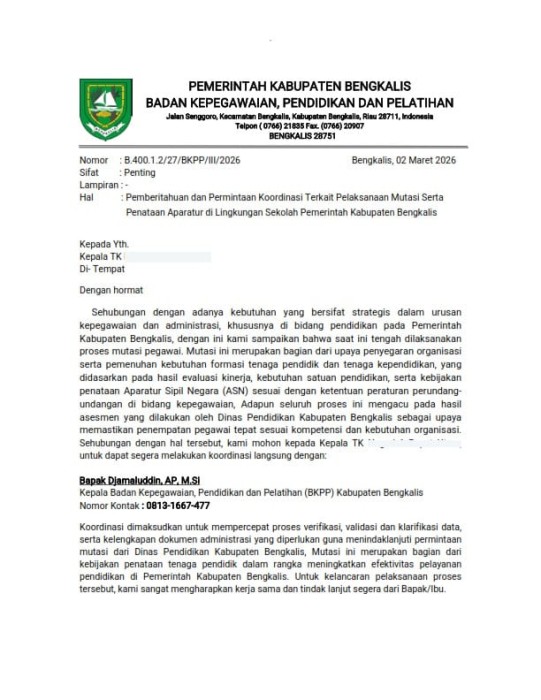 Sehubungan dengan hal tersebut, kami mohon kepada Kepala TK XXXXX (ditutup, red) untuk dapat segera melakukan koordinasi langsung dengan: Bapak Djamaluddin, AP, M.Si, Kepala Badan Kepegawaian, Pendidikan dan Pelatihan (BKPP) Kabupaten Bengkalis, Nomor Kontak: 0813-1667-477.