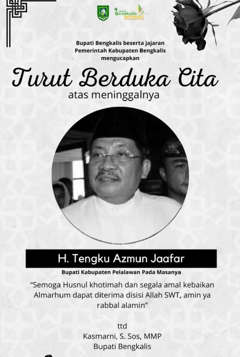 “Atas nama pribadi, keluarga, dan Pemerintah Kabupaten Bengkalis, kami menyampaikan duka cita yang mendalam atas wafatnya ayahanda kita Bapak H. Tengku Azmun Jaafar. Semoga segala amal ibadah almarhum diterima Allah SWT, diampuni segala salah dan khilaf, serta ditempatkan pada tempat yang terbaik di sisi-Nya. Kemudian untuk keluarga yang ditinggalkan agar diberikan kesabaran dan ketabahan dalam menghadapi cobaan ini. Aamiin,” ungkap Bupati Kasmarni.