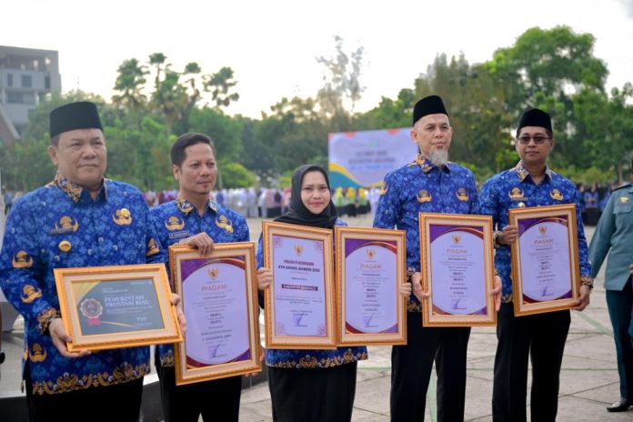 Plt. Gubernur Riau, SF Hariyanto, menyerahkan langsung kedua penghargaan ini kepada Bupati Kasmarni.