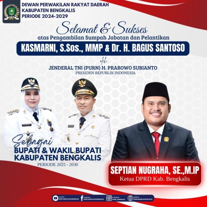 Suarasatu.co, Bengkalis – Ketua DPRD Kabupaten Bengkalis, Septian Nugraha, SE., M.IP, menyampaikan ucapan selamat dan sukses atas pelantikan Bupati dan Wakil Bupati Kabupaten Bengkalis, Kasmarni, S.Sos., M.MP, dan Dr. H. Bagus Santoso. Keduanya resmi dilantik oleh Presiden Republik Indonesia, Jenderal TNI (Purn) H. Prabowo Subianto, di Istana Kepresidenan pada Kamis, 20 Februari 2025.