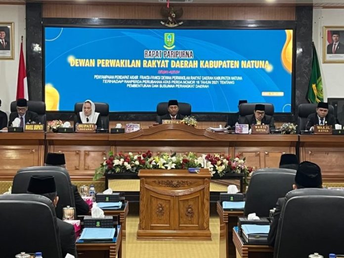 Suarasatu.co, Natuna – Pemerintah Kabupaten Natuna menghadiri Rapat Paripurna Dewan Perwakilan Rakyat Daerah (DPRD) Kabupaten Natuna pada Jum’at, 18 Juli 2025, untuk membahas Ranperda Perubahan atas Perda Nomor 16 Tahun 2021 tentang Pembentukan dan Susunan Perangkat Daerah.