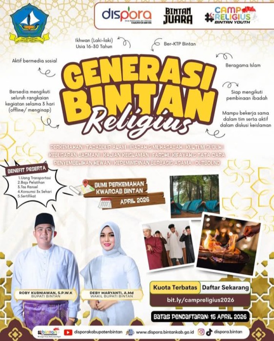 “Saya memanggil pemuda-pemuda hebat di Bintan untuk menjadi generasi religius. Ini adalah ikhtiar bersama agar anak muda Bintan kuat secara fisik maupun spiritual. Harapannya lahir generasi yang memiliki pondasi agama kokoh, sehingga bisa membawa Bintan menjadi daerah yang madani dan Islami,” ujar Roby, Jumat (3/4/2026).