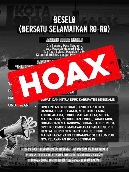 Suarasatu.co, Bengkalis – Selebaran digital berjudul “Beselo (Bersatu Selamatkan Ro-Ro)” yang beredar luas di masyarakat, mencantumkan tempat, tanggal, dan narasumber dengan mencatut nama Bupati Bengkalis dan Ketua DPRD Kabupaten Bengkalis, dinyatakan sebagai berita tidak benar atau hoaks.